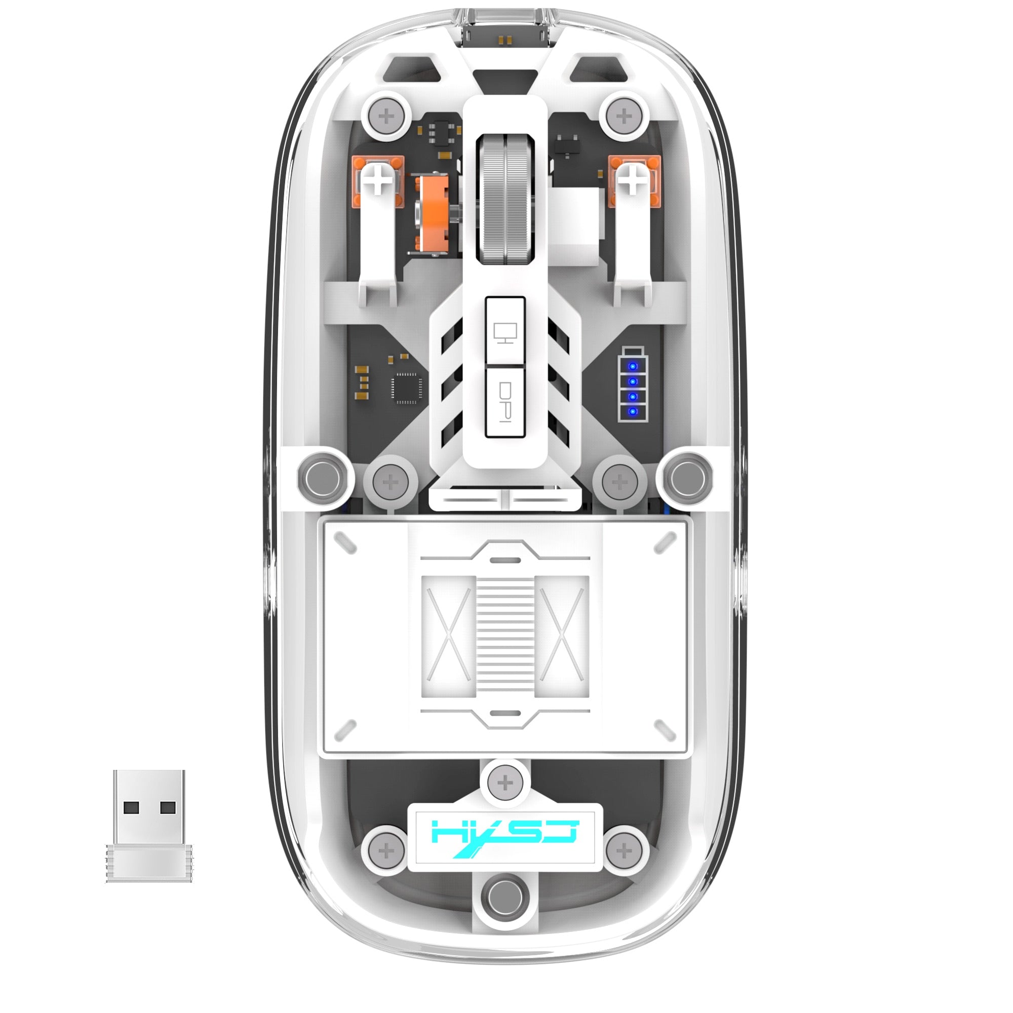 3. Low voltage prompt: When the mouse is about to run out of power, the last grid of the battery light flashes an alarm prompt.